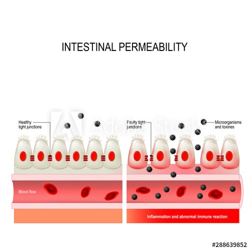 The lining of your gut becomes damaged and allows undigested food particles, toxic waste products, and bacteria to “leak” through to your bloodstream. These foreign substances can cause an immune response in the body including inflammation. The digestive system is meant to protect your body from these harmful substances, the walls of the intestines act as barriers, controlling what enters the bloodstream and is transported to your organs. In a healthy gut, there are small gaps in the intestinal wall called tight junctions that allow water and nutrients to pass through while blocking the passage of harmful substances. So when these tight junctions (a protein) open up, for many reasons, this may allow bacteria and toxins to pass from the gut into the bloodstream, leaky gut. It is this idea that is thought to cause widespread inflammation and potentially trigger the immune system and autoimmune diseases.